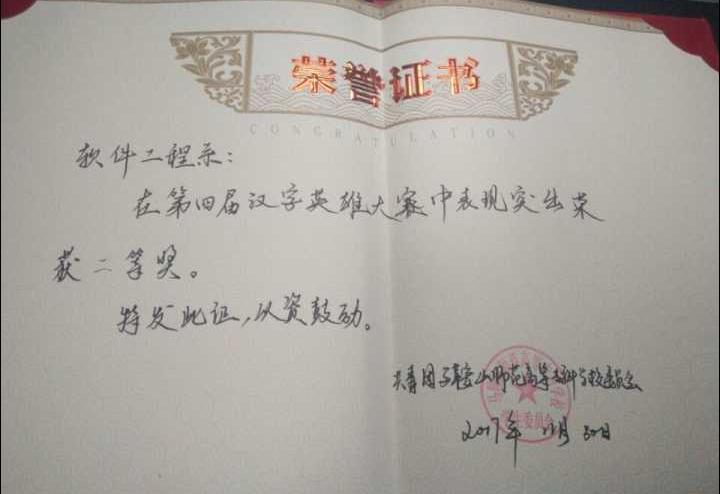 首先,由主持人对本次活动流程进行介绍,之后活动正式开始。比赛共有三个环节:分别是各显神通、我最棒以及我们是大文豪。第一个环节是以看图猜成语的形式进行,比赛开始后,我系参赛选手看到图片后快速思考,积极作答,获得不错的分值。比赛继续进行,第二轮是听写词语的形式,经过上一轮的比赛,台上的同学似乎更加进入状态,题目作答时能更加沉着的应对。比赛进入尾声,最后一轮的文学常识,每位参赛选手都积极地把握最后的得分机会,将自己的能力全部展现了出来。经过激烈的比拼,综合三项得分,我系选手以优异的表现获得了汉字英雄大赛二等奖的好成绩。2017级软件技术(3)班的尹胜男同学也以出色的表现获得了汉字英雄奖。
