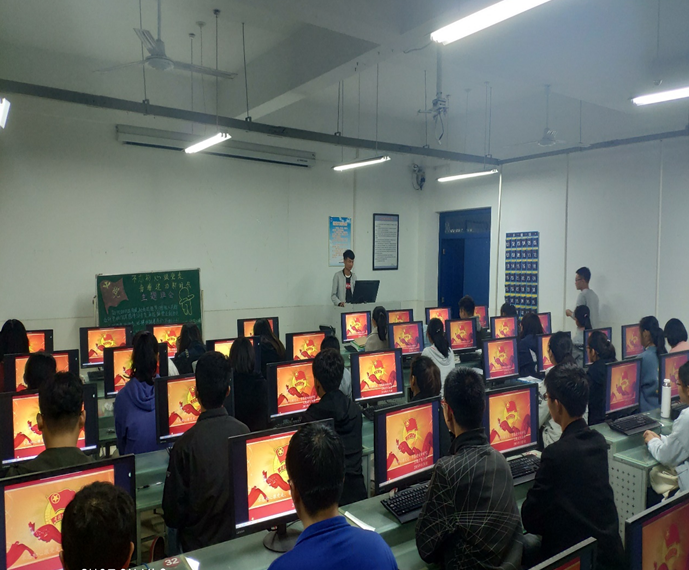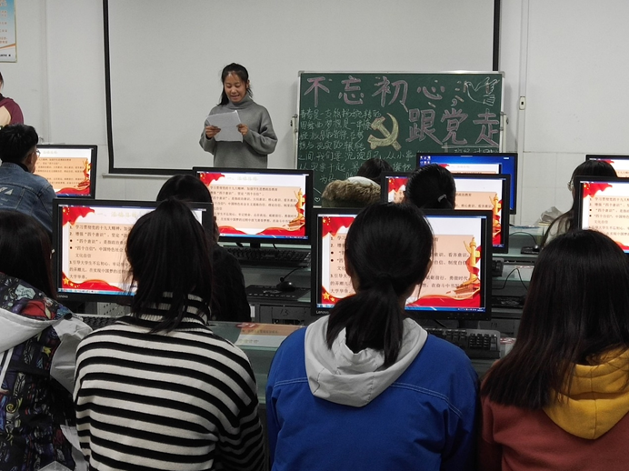 此次活动先由各班团支书介绍活动目的,即学习贯彻党的十九大精神,加强学生思想政治教育, 增强“四个意识”、坚定 “四个自信”,引导大学生不忘初心、牢记使命、志存高远、砥砺前行,勇做时代的弄潮儿。走进2018级网络技术2班教室,团支书谢杭正在给同学们普及中国的发展历史和党的发展历史,让大家能更加了解党的发展历程。随后,全体同学集中观看了视频《不忘初心》,并组织围绕“如何不忘初心跟党走”进行交流发言。丁慧同学说,我们学习的是网络技术专业,作为新时代的青年,我们要努力学好专业知识,用现代信息技术服务好社会。现场讨论气氛热烈,同学们纷纷表示:要对照总书记对广大青年提出的五点希望,认真进行自我评议,努力学习,不断提高个人素养和职业素质,为实现中华民族伟大复兴的中国梦贡献更多的青春力量。