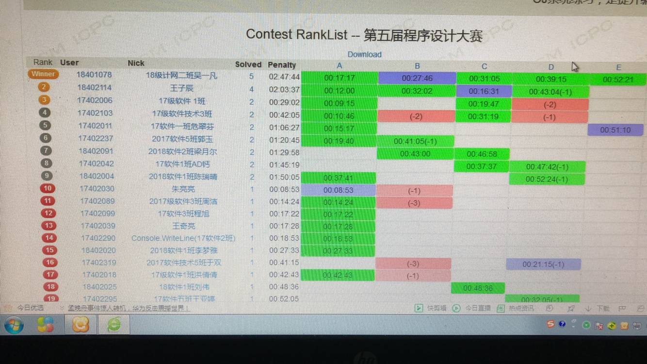 本次程序大赛初赛和复赛部分组成,初赛是让同学在指定的时间内,登录我校oj系统,完成上面程序设计的题目,排名前100名的同学入围决赛决赛考试也是通过oj系统来出题和评分。