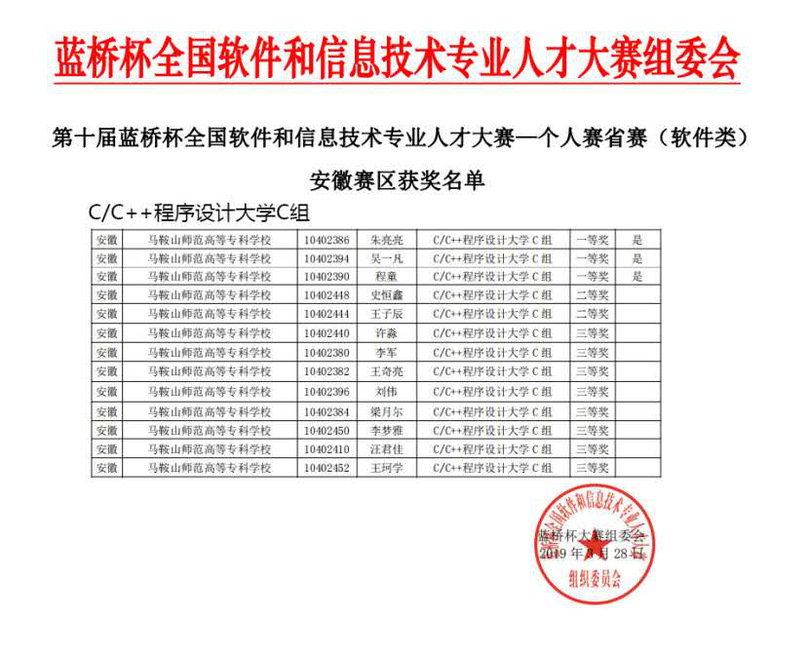 本网讯 3月28日,喜报传来,马鞍山师范高等专科学校软件工程系在由教育部高等学校计算机科学与技术教学指导委员会、工业和信息化部人才交流中心共同主办的“全国软件专业人才设计与创业大赛”暨第十届蓝桥杯大赛省赛中取得优异成绩,学校软件工程系(软件与互联网学院)24名同学获奖,4名同学进入国赛。