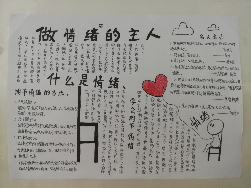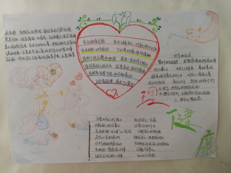 本次活动的参赛者是软件工程系2017级、2018级学生,他们通过制作“心漫画”和“心理健康手抄报”的形式,向系部全体同学宣传心理健康知识,表达健康、积极向上的生活态度。同学们自己收集各种资料、图片,设计、制作漫画、手抄报,将自己的心灵之声绘画成立意新颖、创意独特的手抄报,用最绚丽的图案、最生动的语言文字、最真实的情感,展示了“我阳光,我健康,我快乐”的生活态度,提高了同学们制作漫画、手抄报的能力,增强了同学们的心理素质。最后,经过评审,2018级软件技术3班的马子涵同学脱颖而出,获得了本次比赛的一等奖。