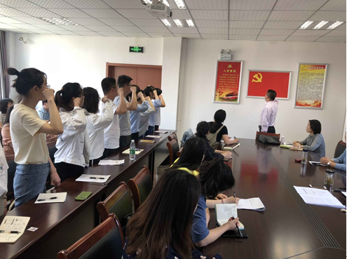 大会第四阶段,全体同志起立奏唱中华人民共和国国歌。第二党支部书记胡军同志带领全体新党员宣读入党誓词。
