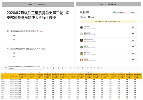 线上党建,程序不简。党员大会逐一讨论了15名拟转正的预备党员的转正问题。首先,预备党员汇报预备期间思想、学习及工作等相关情况,尤其是在这次疫情防控中的表现;其次,入党介绍人、支委会成员分别报告预备党员在预备期间的教育考察情况,并对其能否转正发表意见;再次,支部有表决权的正式党员通过在线文档进行了“线上表决投票”。根据表决结果,11名正式党员一致同意陈珂、钱艳晴等15名同志按期转为中共正式党员。