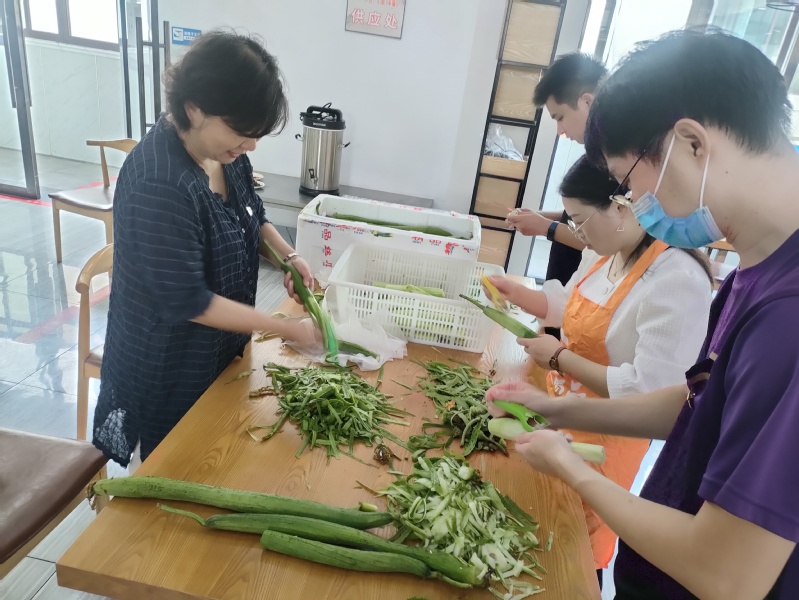 上午八点半,全体党员一到食堂就迅速系上围裙,从三尺讲台上的教师秒变成灶台餐盘前的大厨。大家在工作人员的指导下,分组行动、协同配合,有的打扫卫生、有的摘菜洗菜,在劳动中交流工作、沟通思想,略显平静的食堂瞬间热闹起来。经过近一个小时的辛勤劳动,食堂大厅窗明几净,案板桌台前摘洗过的食材摆放整齐,大家在欣赏自己劳动成果的同时也体悟到各行各业的艰辛不易,感恩食堂工作人员为教职员工提供美味可口的饭菜。
