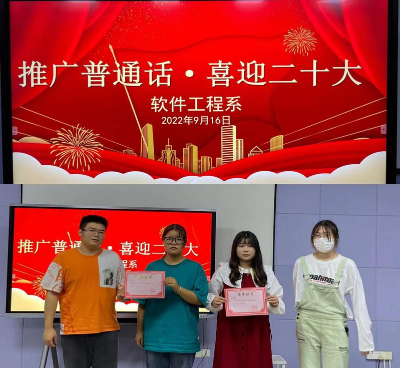 本网讯 为迎接党的二十大顺利召开,进一步增强系部师生运用语言文字的规范意识和规范能力,促进语言文字规范化工作不断深入开展。9月16日下午6:30分,软件工程系于行知楼601举办了“推广普通话,喜迎二十大”主题演讲比赛。系部团总支副书记李顺顺、辅导员崔杨和学生会主席担任评委。