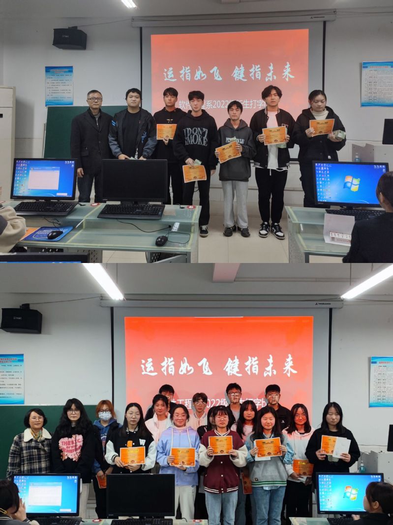 比赛前,通过班级晋级赛,从各班级选出6名同学进入决赛。决赛当天,选手们早早地来到比赛场地认真备战。选手们目光如注,手指在键盘上飞速略过,敲击出炫彩的“音符”。决赛运用《金山打字通》软件,并要求选手们在规定时间内,打完同一篇文章,根据打字的速度和正确率来确定成绩。经过紧张的角逐,最终22级数字媒体技术1班孔琬、22级计算机网络技术1班秦禹、22级软件技术2班任诗洋等6名同学获得一等奖,22级软件技术1班胡祺等9名同学获得二等奖,22级软件技术1班韩亚萍等15位同学获得三等奖,22级软件技术1班曹文等6名同学获得优秀奖。系领导为获奖同学颁发奖状及奖品。
