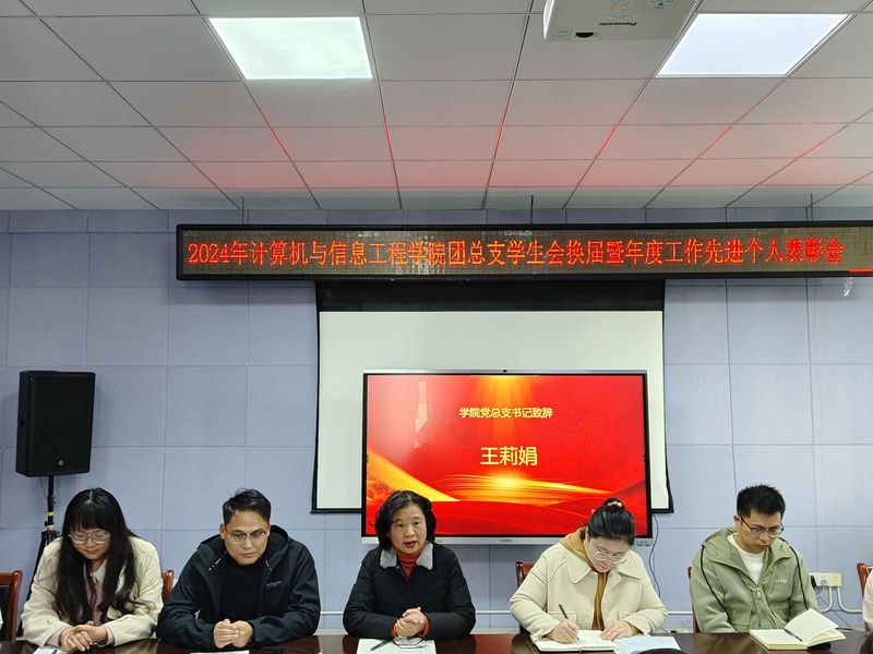 11月27日,必赢242net官网团总支学生会换届暨年度工作先进个人表彰会在行知楼601召开。学院党总支书记王莉娟、副书记曾甜、团总支委员以及学生会全体成员参加了本次会议。