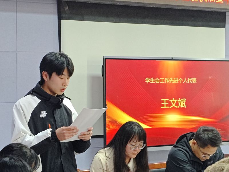 随后,学生会工作先进个人代表王文斌、新一届学生会工作负责人朱国庆进行了发言,他们代表全体学生会成员表达了积极投身于工作,全力为师生服务的决心。