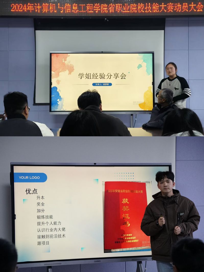 会上,学院邀请了通过技能大赛免试升本的2024级计算机科学与技术专业李壮壮、徐梦婷两名同学作为代表先后发言,分享了他们在备赛与参赛过程中的宝贵经验与深刻心得,提供了切实可行的备赛建议,鼓舞了备赛学生们的士气。